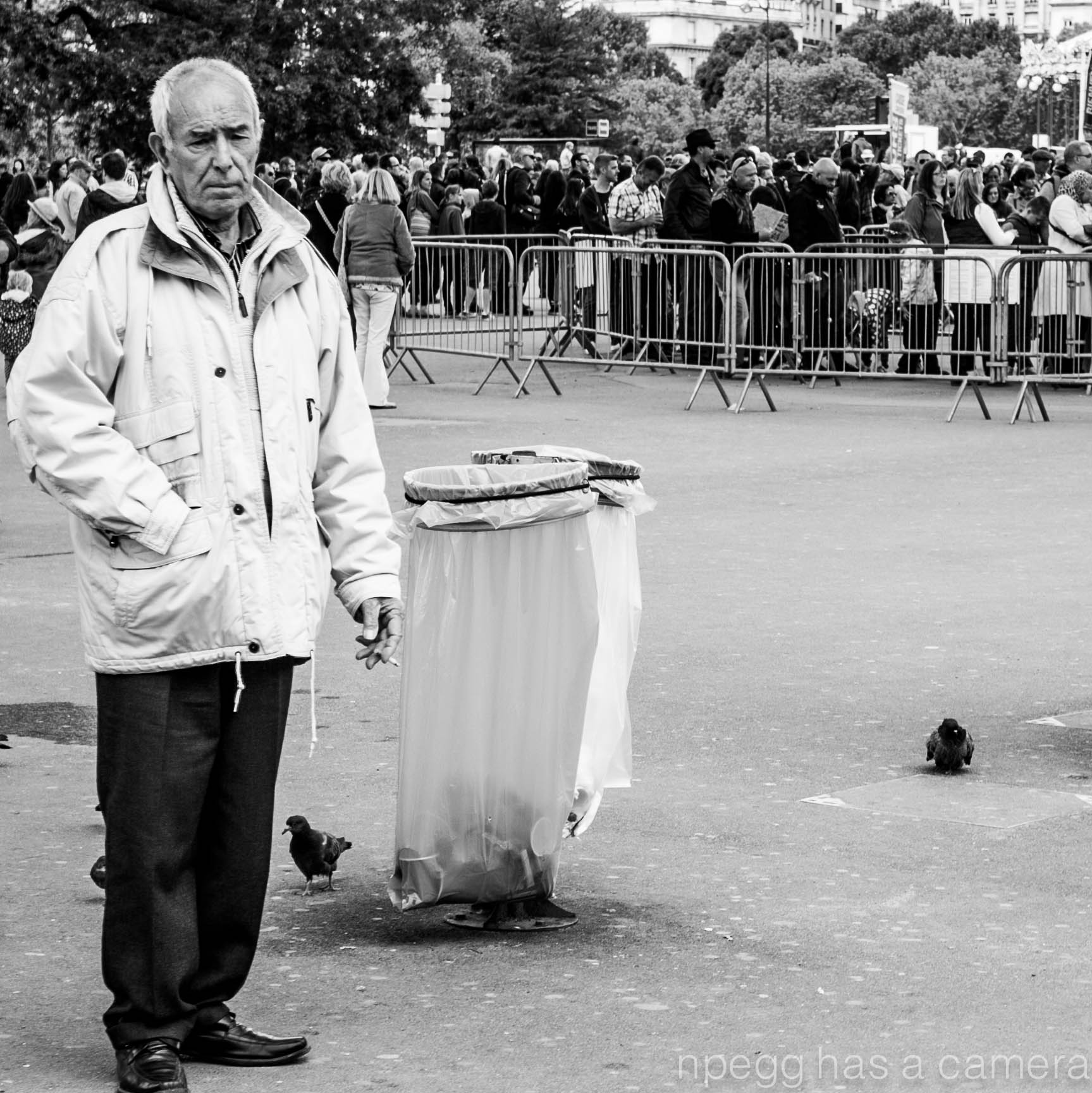 I spotted this guy underneath the Eiffel tower by a garbage can. I assumed right away that he was a local of the area here in Paris. The picture shows him reaching in his pocket. The context is, this man was feeding the few pigeons that you see scattered around him.