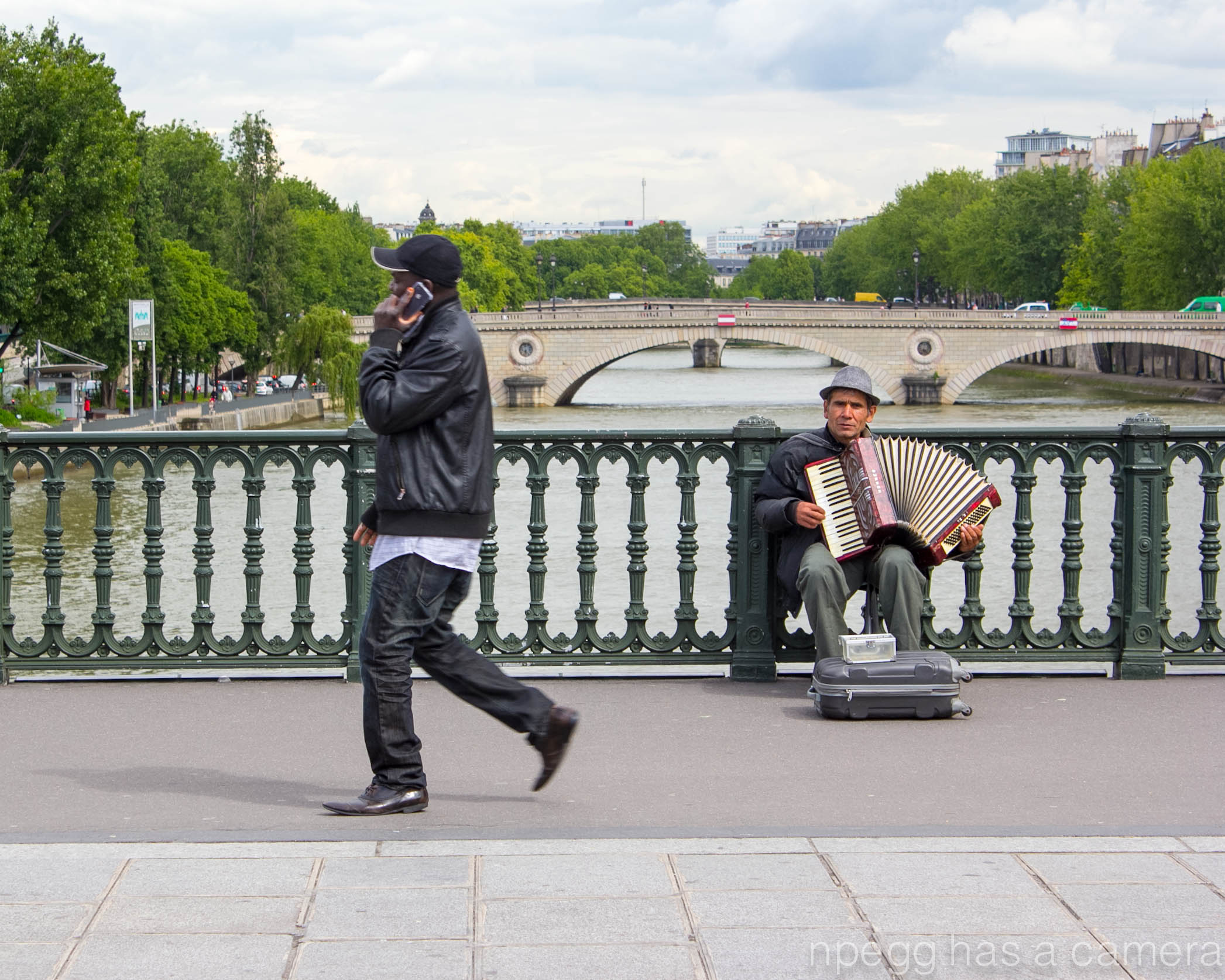 At first glance, we see he is playing an accordion on a bridge. – This photo was taken May 29, 2013 in Paris, Somewhere near Notre Dame. So it is a very well tourist populated area, loaded with street performers and beggars.