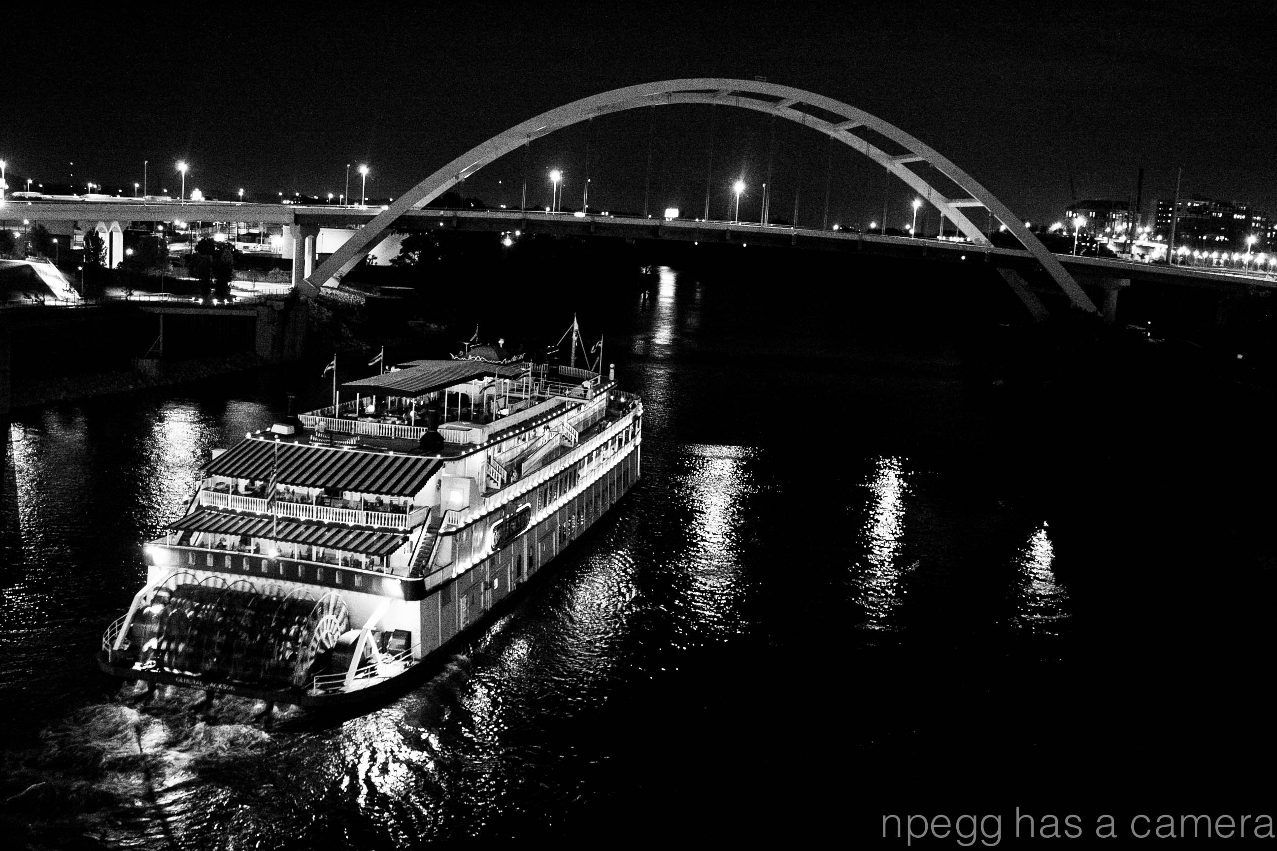 I was in Nashville for the night on the 12th of August and took a walk up the pedestrian bridge that connects downtown to basically the football stadium. While walking a notcied an actual river paddle boat rolling up river. So I ran. – Broke a sweat. And, took this picture. –